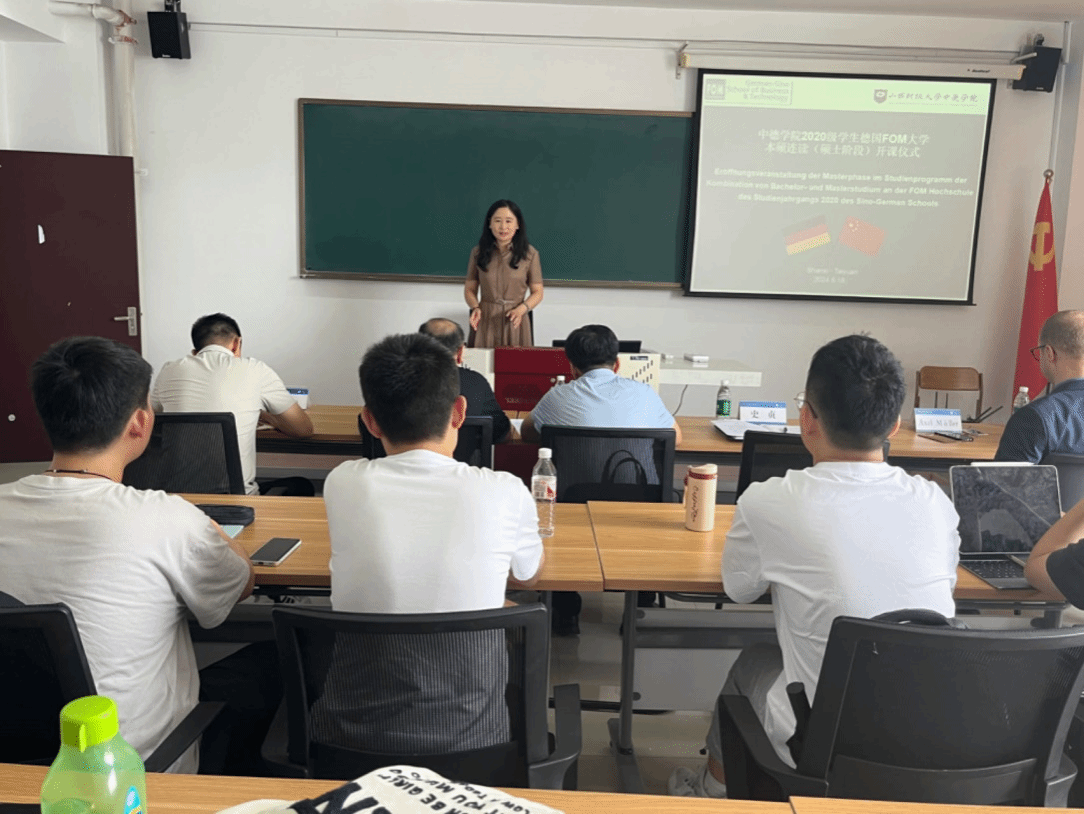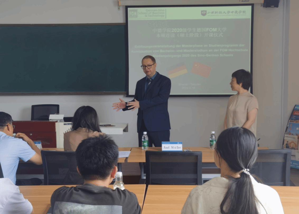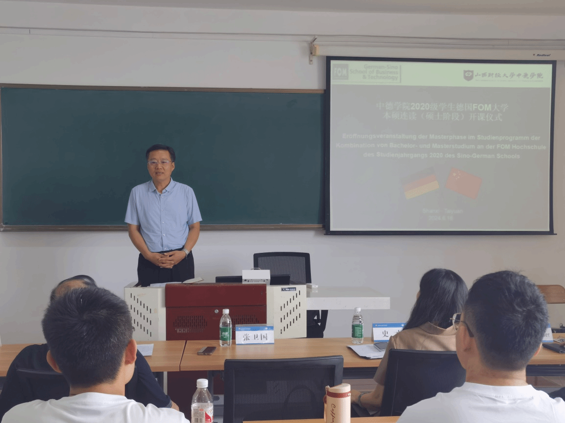 best365官方网站登录入口首届FOM大学本硕连读班(硕士阶段)开课仪式在我校坞城校区博学楼812教室举行,党委常委、副校长张卫国出席开课仪式并讲话,FOM大学教学院长Axel Müller、best365官方网站登录入口全体班子成员参加开课仪式。开课仪式由best365官方网站登录入口副院长王秀娟主持。
