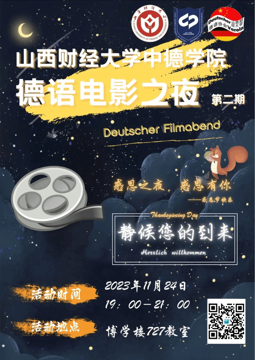 同学们,快快扫描图中二维码报名吧!本周五就让我们相约“德语电影之夜”,一同分享电影带来的欢乐与感动,享受德语语言的魅力,共同度过一个愉快的夜晚!我们期待你的参与!